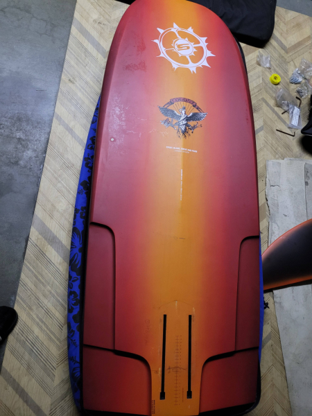 Stále k dispozici za tuto super cenu set na windfoil vhodný i pro začátečníky, dá se na něm začít i na wingu. Včetně obalu plováku na míru, foil má svůj originání obal. Bez leashe na foto. Běžné oděrky, žádné funkční vady.